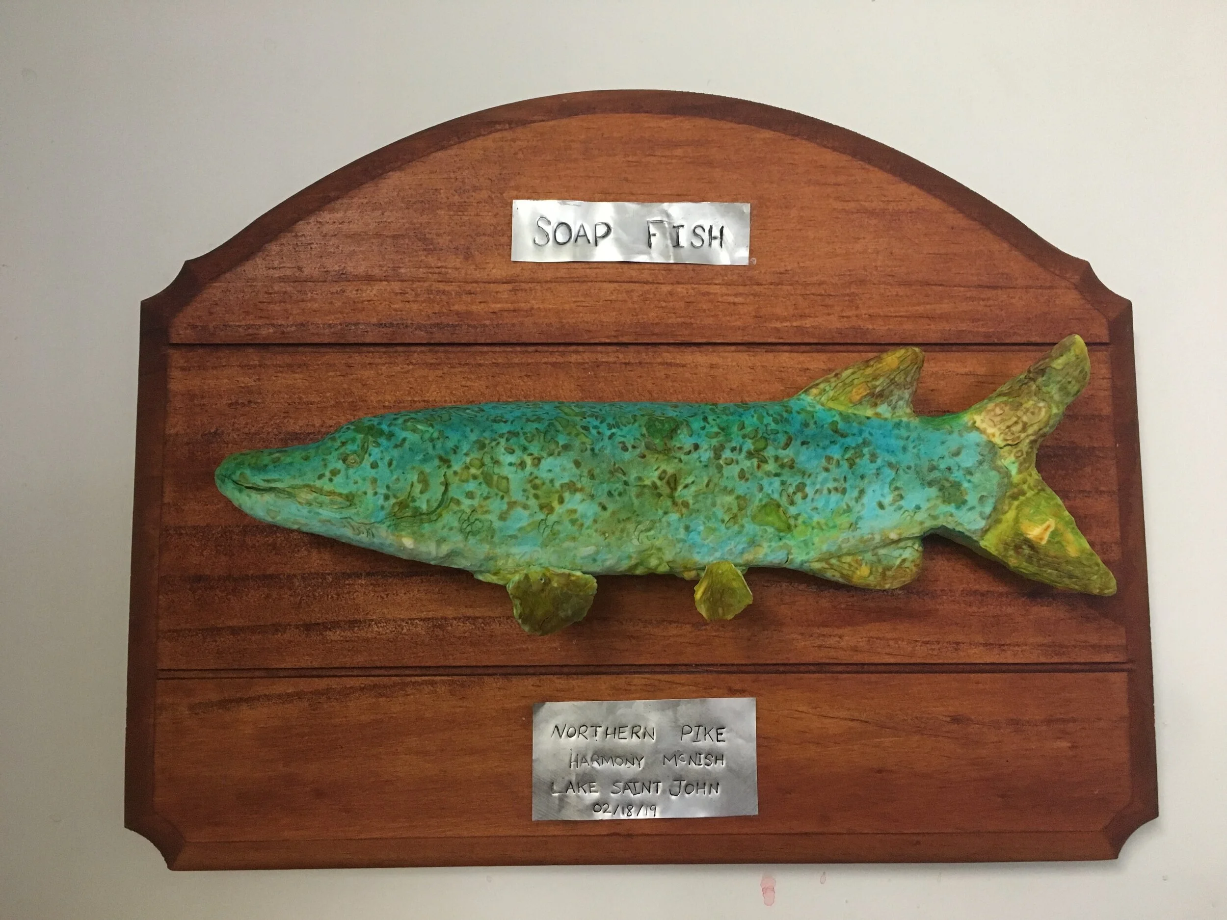 “The work Soap Fish is inspired from my fishing experiences, it is best described through a fishing tale. This story is not an exaggerated or a comical one but a depiction of contaminated waters and human impact on habitats. Soap Fish first developed on 02/18/19 when I caught a Northern Pike on Lake Saint John. I would like to recognize that Lake Saint John shores are a part of the Mnjikaning First Nation Indian Reserve No. 32 in Ramara township, Ontario. As I brought the fish home to prepare to share and eat the being, an individual shared “If you eat this fish it would be the same as eating soap” referencing the water contamination from an offshore soap factory dumpage. I was unfamiliar with the history and environmental conditions of the Lake. To continue with my story, when I was skinning the fish an oily residue spilled out and I noticed clear lumps on the body. That observation was when I realized I needed to create an awareness regarding the issue the factory has created for the locales - human and non-human. Even though the warning signs and cautionaries to eating from Lake Saint John I ate and shared the fish because I took the beings life. Soap Fish became a taxidermy like representation of my experience and an honorary of the life I took. Usually, a taxidermy fish is merely a trophy to a fishing story, whereas Soap Fish, a taxidermy like replica, is meant to bring awareness to the contamination of Lake Saint John.”